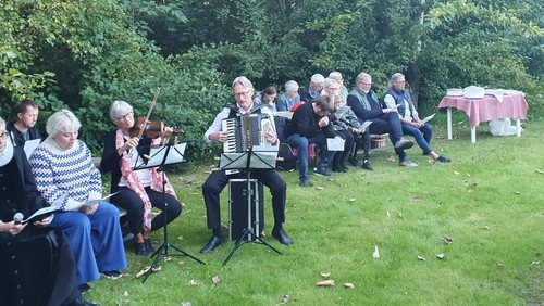 Alle er velkomne til at slå sig ned ved bord-bænkesættene eller på medbragte tæpper eller havestole. Efter gudstjenesten hygger vi os med kaffe og masser af kage.